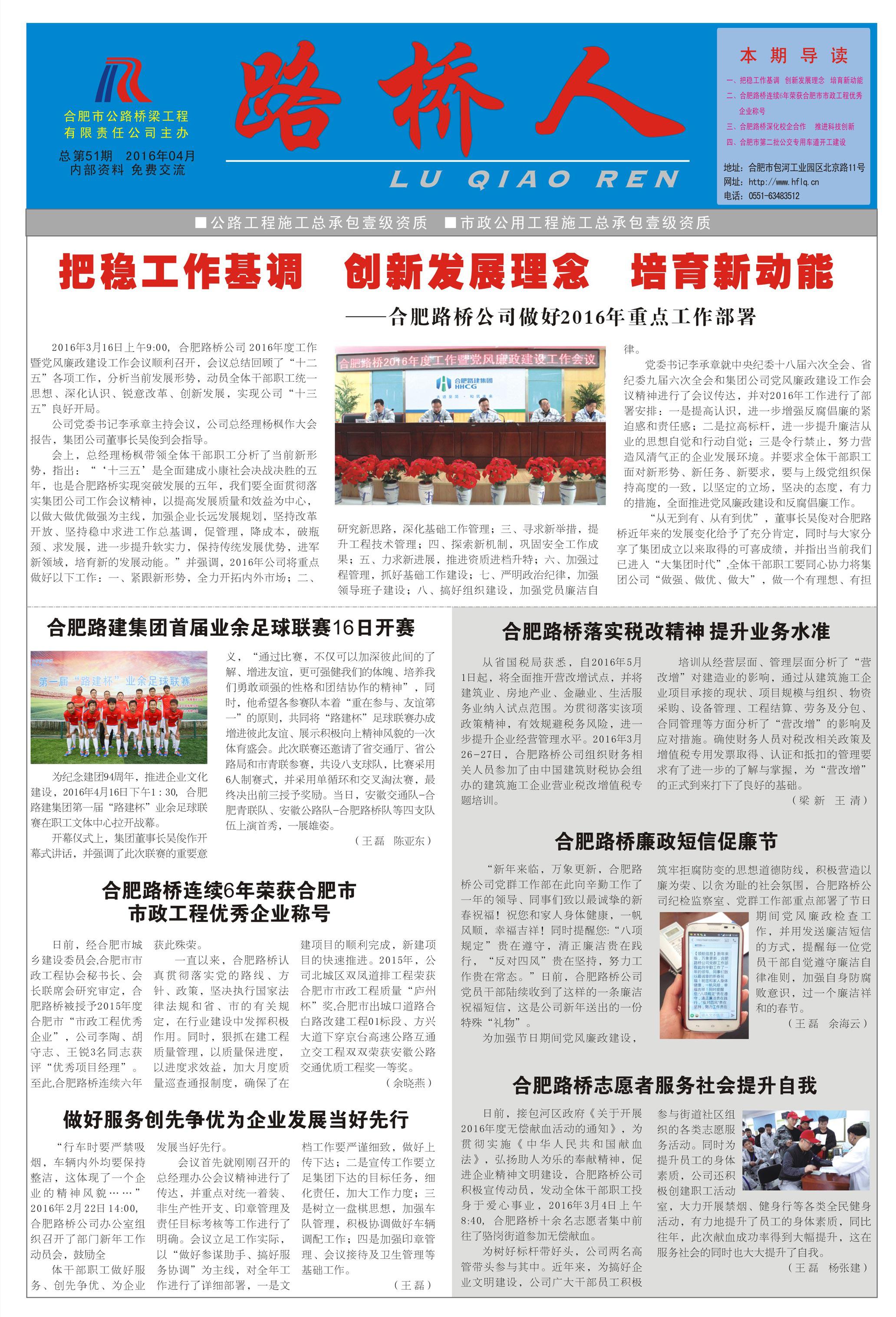 信息宣傳工作是教育、激勵(lì)員工的一種方式,是企業(yè)不可缺少的一項(xiàng)工作, 它為企業(yè)發(fā)展提供強(qiáng)有力的思想保證、智力支持和精神動(dòng)力,是塑造企業(yè)外部形象的主要渠道。一直以來,合肥路橋高度重視企業(yè)信息宣傳工作,并委任專人負(fù)責(zé),成立以公司辦公室為中心和基層通訊報(bào)道員為骨干的通訊報(bào)道網(wǎng)絡(luò)。同時(shí),公司依托一網(wǎng)一報(bào)(合肥路橋公司網(wǎng)站、《路橋人》)及時(shí)、準(zhǔn)確向各級(jí)主管部門、社會(huì)媒體報(bào)送有質(zhì)量、有影響力的信息,傳遞路橋員工正能量,年均撰寫企業(yè)技術(shù)創(chuàng)新、改革發(fā)展、企業(yè)管理、工程建設(shè)等報(bào)道百余篇,大大提高了企業(yè)知名度,樹立了企業(yè)良好的形象,并不斷努力為建筑行業(yè)信息宣傳工作做出積極的貢獻(xiàn)。(余曉燕、王磊)