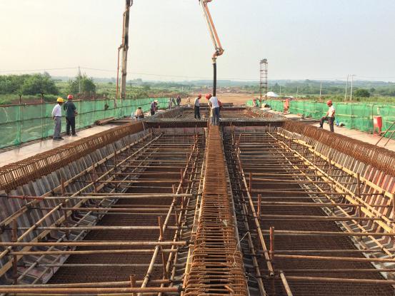 首頁(yè) > 新聞中心 > 詳細(xì)新聞 2016年7月17日上午8時(shí)26分,合肥路橋高新區(qū)將軍嶺路(響洪甸路-長(zhǎng)江西路)道排及附屬工程項(xiàng)目部展開(kāi)大別山路上跨橋0#臺(tái)-3#墩右幅箱梁現(xiàn)澆筑施工,截止當(dāng)日下午12時(shí)右幅箱梁混凝土澆筑完成。目前,該段左幅支架搭設(shè)及底模板安裝已完成,地板鋼筋、腹板鋼筋綁扎及預(yù)應(yīng)力管道鋪設(shè)正進(jìn)行中。與此同時(shí),9#臺(tái)-6#墩右幅支架搭設(shè)完畢,模板安裝、鋼筋綁扎正在施工中。