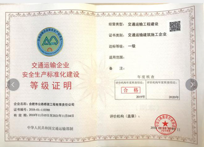 首頁 > 新聞中心 > 詳細(xì)新聞近日,經(jīng)過中國公路建設(shè)行業(yè)協(xié)會(huì)評審,合肥路橋順利通過交通部“交通運(yùn)輸企業(yè)安全生產(chǎn)標(biāo)準(zhǔn)化建設(shè)一級企業(yè)”復(fù)審,此次通過復(fù)審是對公司在安全生產(chǎn)管理、標(biāo)準(zhǔn)化建設(shè)方面做出的努力的最好的肯定。