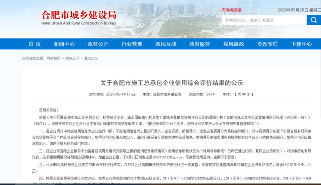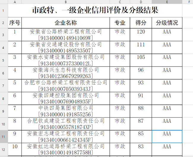 首頁 > 新聞中心 > 詳細(xì)新聞5月14日,合肥市城鄉(xiāng)建設(shè)局發(fā)布合肥市施工總承包企業(yè)信用綜合評(píng)價(jià)結(jié)果,合肥路橋在330家市政特、一級(jí)企業(yè)中,以市政板塊第五名的成績(jī)獲評(píng)AAA級(jí)信用評(píng)價(jià)。本次評(píng)價(jià)經(jīng)企業(yè)申報(bào)、主管部門審核、網(wǎng)上公示等環(huán)節(jié),前后歷時(shí)1個(gè)多月,共有42家建筑企業(yè)為AAA級(jí)。