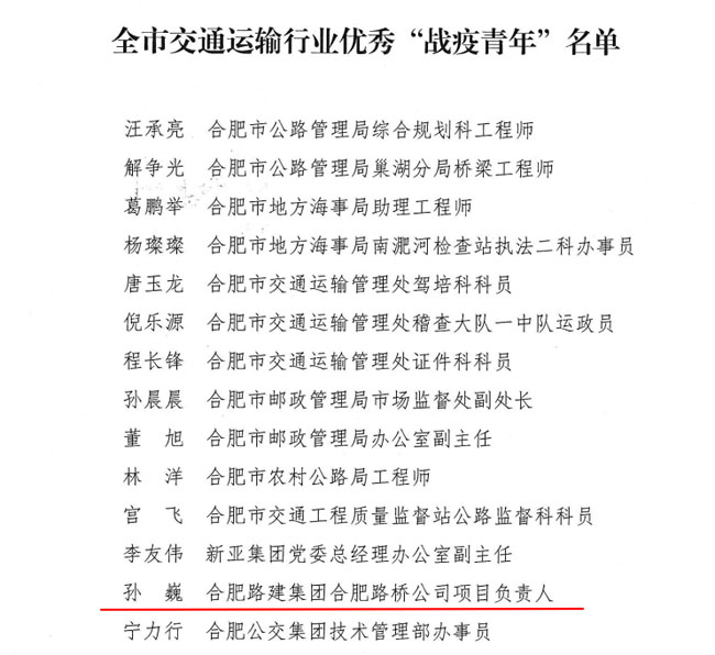 首頁 > 新聞中心 > 詳細(xì)新聞6月2日,在市交通運(yùn)輸局黨組發(fā)布的30名全市交通運(yùn)輸行業(yè)優(yōu)秀“戰(zhàn)疫青年”名單中,合肥路橋?qū)O巍同志獲“戰(zhàn)疫青年”榮譽(yù)稱號(hào)。
