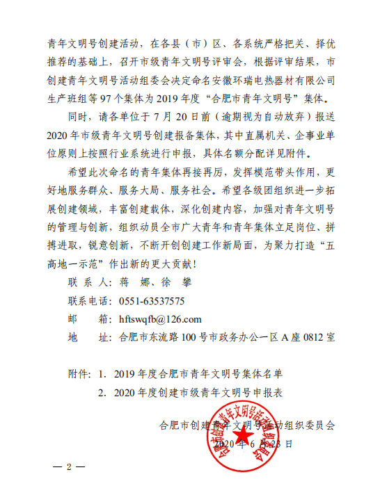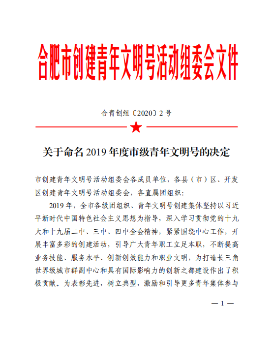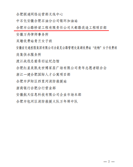 首頁 > 新聞中心 > 詳細(xì)新聞近日,合肥市創(chuàng)建青年文明號(hào)活動(dòng)組委會(huì)印發(fā)了《關(guān)于命名2019年度市級(jí)青年文明號(hào)的決定》,合肥路橋天都路項(xiàng)目部榮獲“2019年度市級(jí)青年文明號(hào)”榮譽(yù)稱號(hào)。