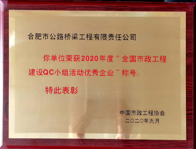 首頁 > 新聞中心 > 詳細新聞2020年度全國市政工程建設優(yōu)秀QC小組活動成果發(fā)布會于2020年8月25日至27日在浙江杭州、9月23日至25日在安徽合肥分兩批次召開,合肥路橋再次榮獲2020年度“全國市政工程建設QC小組活動優(yōu)秀企業(yè)”稱號。