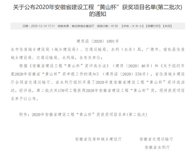 近日,從安徽省住房和城鄉(xiāng)建設(shè)廳獲悉,由省住房城鄉(xiāng)建設(shè)廳會(huì)同省交通運(yùn)輸廳、省水利廳組織開展的2020年度安徽省建設(shè)工程“黃山杯”獎(jiǎng)評(píng)選活動(dòng)中由合肥路橋承建的“九龍路(繁華大道-方興大道)等道路改造綠化、景觀及立面整治工程一標(biāo)段”工程和“環(huán)巢湖連接線欄桿集鎮(zhèn)至環(huán)湖大道工程(S215欄濱路)”工程獲得了“黃山杯”獎(jiǎng)。(葉凡、何小兵)