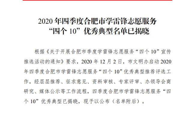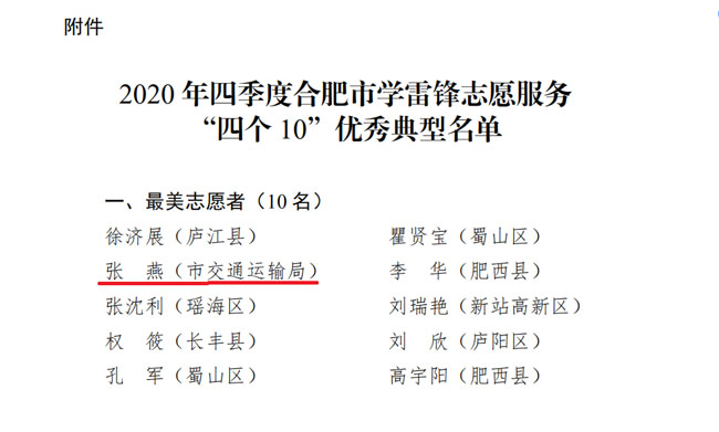 首頁 > 新聞中心 > 詳細新聞1月25日,在市文明辦啟動的 2020 年四季度合肥市學雷鋒志愿服務“四個 10”優(yōu)秀典型推薦評選工作中,合肥路橋張燕同志以突出的表現(xiàn)榮獲最美志愿者稱號。