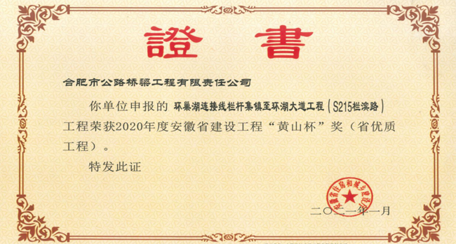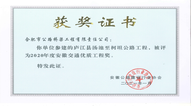 首頁 > 新聞中心 > 詳細新聞3月20日,2020年度安徽省公路水運建設工程“黃山杯”獎暨安徽交通優(yōu)質(zhì)工程獎頒獎大會在合肥市高速開元酒店召開,由合肥路橋承建的環(huán)巢湖連接線欄桿集鎮(zhèn)至環(huán)湖大道工程(S215欄濱路)榮獲2020年度安徽省建設工程“黃山杯”獎,合肥路橋承建的廬江縣湯池至柯坦公路工程被評為2020年度“安徽交通優(yōu)質(zhì)工程獎”。