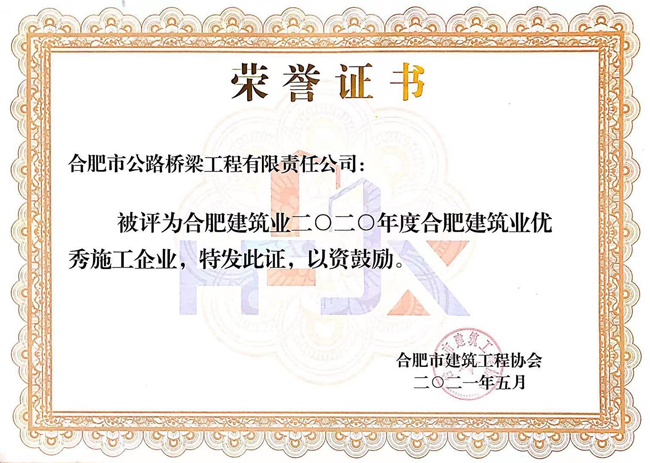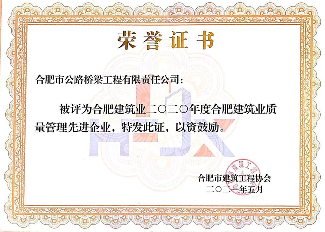 首頁 > 新聞中心 > 詳細新聞日前,從合肥市建筑業(yè)工程協(xié)會獲悉,2020年度合肥市優(yōu)秀企業(yè)、先進企業(yè)、優(yōu)秀項目經(jīng)理的評選結(jié)果已經(jīng)出爐。合肥路橋被評為合肥建筑業(yè)2020年度優(yōu)秀施工企業(yè)、2020年度質(zhì)量管理先進企業(yè)。