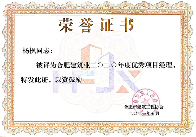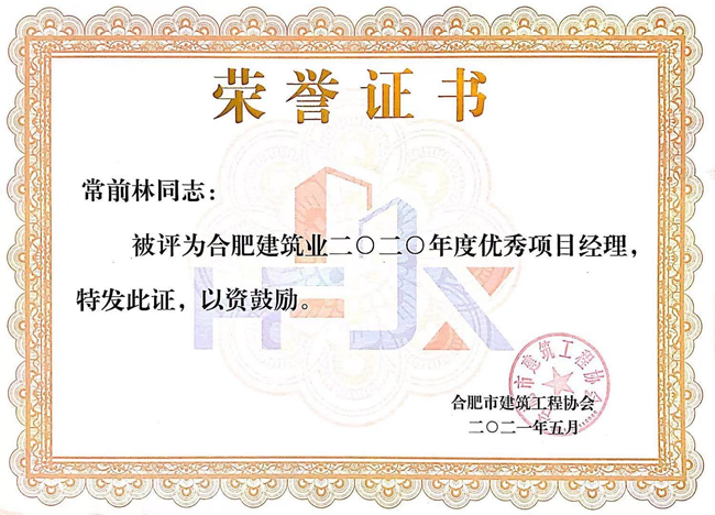 此榮譽證書主要是表彰企業(yè)2020年度在經(jīng)營管理指標(biāo)先進,企業(yè)年度總產(chǎn)值、產(chǎn)值利潤率、工程質(zhì)量和安全文明在行業(yè)均處于領(lǐng)先地位。此外,楊楓、常前林兩位同志被評為合肥建筑業(yè)2020年度優(yōu)秀項目經(jīng)理。(葉凡)