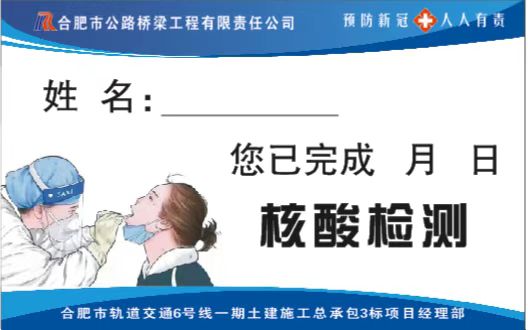 首頁 > 新聞中心 > 詳細新聞為應對當前嚴峻復雜的疫情防控形勢,方便振興南路站疫情防控工作需要,準確把控項目部全員核酸檢測,做到應檢盡檢、不漏一人。合肥路橋借鑒標簽的形式,制作核酸檢測標識貼,在完成全員核酸檢測的同時每人會發(fā)放一張簽有姓名和時間的核酸檢測標識貼,指定貼于安全帽側面,作為出入施工現場、辦公區(qū)、生活區(qū)的有效憑證,一目了然、便于識別。