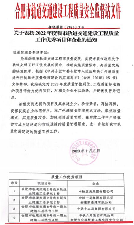 首頁 > 新聞中心 > 詳細新聞春節(jié)臨近,合肥路橋地鐵項目受到合肥市軌道交通質(zhì)監(jiān)站表彰,記優(yōu)良行為記錄。