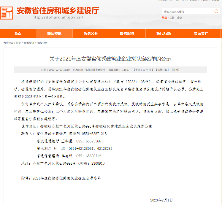 據悉,2021年度安徽省優(yōu)秀建筑業(yè)企業(yè)評選是安徽省住房和城鄉(xiāng)建設廳、安徽省交通運輸廳、安徽省水利廳聯(lián)合開展的第二屆認定評選活動。評選標準分別從社會責任履行、企業(yè)經營發(fā)展、企業(yè)管理創(chuàng)新、企業(yè)建造能力、企業(yè)文化建設等方面進行評定,是對建筑業(yè)企業(yè)能力的綜合認定。