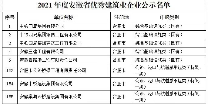 首頁 > 新聞中心 > 詳細新聞近日,安徽省住房和城鄉(xiāng)建設廳發(fā)布了關于“2021年度安徽省優(yōu)秀建筑業(yè)企業(yè)”認定名單,合肥路橋蟬聯(lián)該項殊榮。
