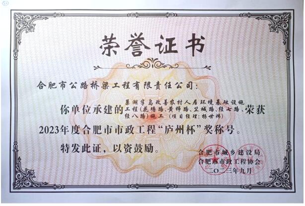首頁 > 新聞中心 > 詳細(xì)新聞日前,從合肥市市政工程協(xié)會獲悉,經(jīng)合肥市城鄉(xiāng)建設(shè)局審定及公示,由合肥路橋承建的巢湖半島人居環(huán)境工程,榮獲2023年度合肥市市政工程“廬州杯”獎。