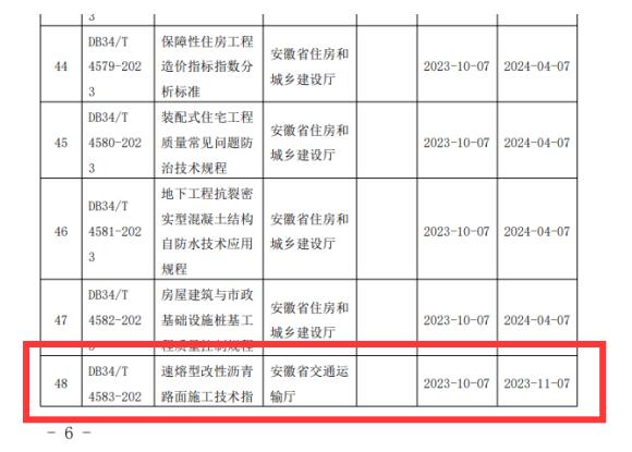 首頁(yè) > 新聞中心 > 詳細(xì)新聞日前,從安徽省市場(chǎng)監(jiān)督管理局獲悉,由合肥路橋主持編制的安徽省地方標(biāo)準(zhǔn)《速熔型改性瀝青路面施工技術(shù)指南》(DB34/T 4583-2023)獲批發(fā)布,并將于2023年11月7日正式實(shí)施。