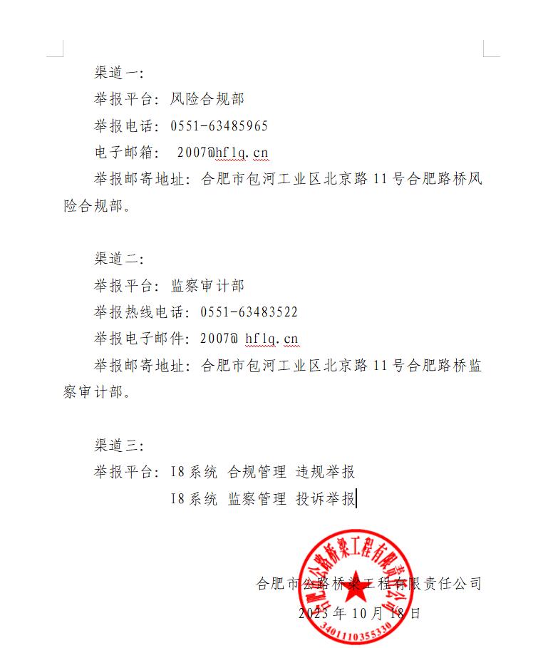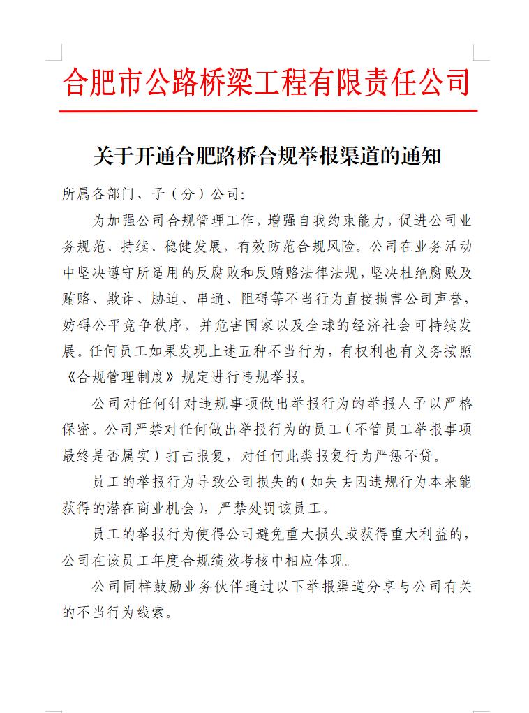 關于開通合肥路橋合規(guī)舉報渠道的通知