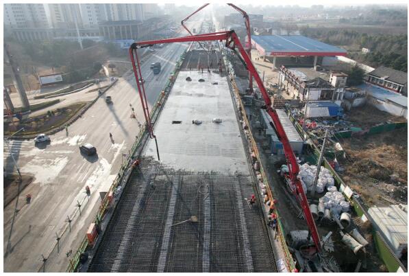 2024年1月8上午,G312合六路快速化改造工程上跨橋迎賓大道第三聯(lián)頂板混凝土澆筑完成,至此迎賓大道上跨橋右半幅順利貫通。