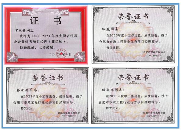 孫巍、楊世煒、楊慶忠3位同志榮獲“合肥市市政工程行業(yè)優(yōu)秀項(xiàng)目經(jīng)理”稱號,宋祖安同志榮膺“安徽省建筑業(yè)企業(yè)優(yōu)秀項(xiàng)目經(jīng)理”稱號。