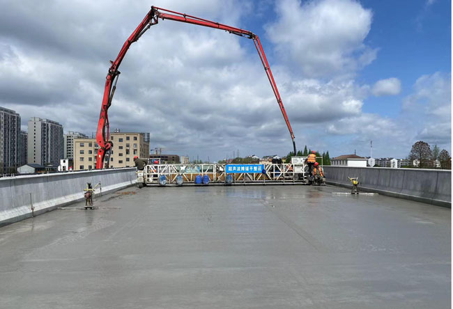 在G312合六路(肥西段)快速化改造工程迎賓大道上跨橋的建設(shè)現(xiàn)場(chǎng),泵車矗立,機(jī)械運(yùn)轉(zhuǎn)繁忙,工人們正展開(kāi)橋面混凝土鋪裝。截至目前,項(xiàng)目已完成4座上跨橋的半幅橋面鋪裝工作。