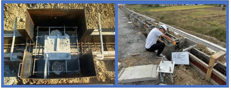 為確保聲屏障基礎(chǔ)質(zhì)量,在完成混凝土模板支設(shè)后,聲屏障班組及時對模板質(zhì)量、鋼筋綁扎效果進行檢查,并在驗收合格立即展開混凝土澆筑。