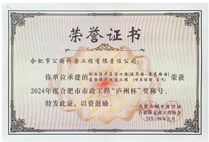 首頁 > 新聞中心 > 詳細新聞日前,合肥市市政工程協(xié)會就《2024年度合肥市市政工程“廬州杯”獎獲獎項目名單》進行了公布。合肥路橋肥西經(jīng)開區(qū)湯口路(延喬路-宜秀路西)道路提升改造工程榮登榜單。