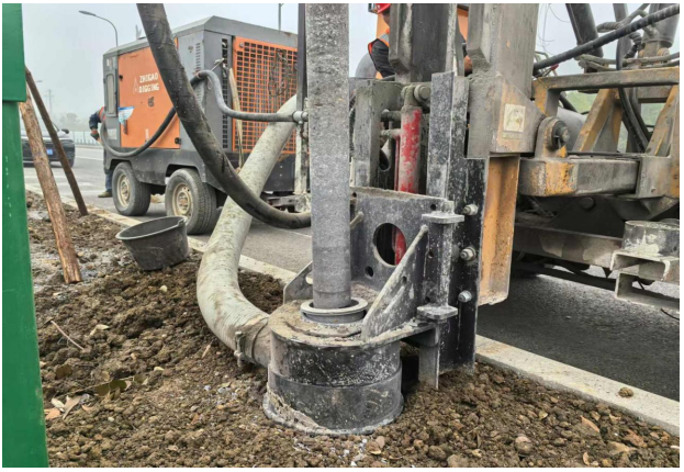 G312合六路(肥西段)快速化改造工程為老路改建項(xiàng)目,經(jīng)過(guò)歷次改建,中分帶基層多為水泥混凝土板塊,防撞護(hù)欄立柱施工必須鉆孔,以往傳統(tǒng)的防撞護(hù)欄立柱鉆孔,耗時(shí)、耗力,極易產(chǎn)生揚(yáng)塵,經(jīng)過(guò)改裝后的鉆孔機(jī)粉塵吸凈率高達(dá)98%,排放滿足PM2.0,無(wú)需灑水車(chē)掃刷即可讓粉塵等全面回收,不僅節(jié)省了車(chē)輛及人工成本,還解決了鉆孔對(duì)周邊環(huán)境的揚(yáng)塵污染,這對(duì)環(huán)保施工具有重要意義。