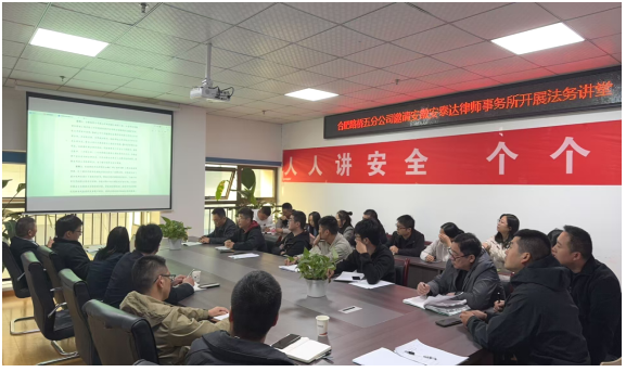 在所屬合肥軌道交通4標(biāo)段項(xiàng)目部會(huì)議室,安泰達(dá)律師事務(wù)所許競(jìng)文律師就施工企業(yè)施工過(guò)程中遇到的合同風(fēng)險(xiǎn)、工程質(zhì)量風(fēng)險(xiǎn)、施工安全風(fēng)險(xiǎn)、勞動(dòng)糾紛風(fēng)險(xiǎn)進(jìn)行了講解。隨后還通過(guò)典型案例分析,深入淺出地講解施工企業(yè)法律風(fēng)險(xiǎn)的具體表現(xiàn)及解決辦法,進(jìn)一步深化學(xué)習(xí)成效。