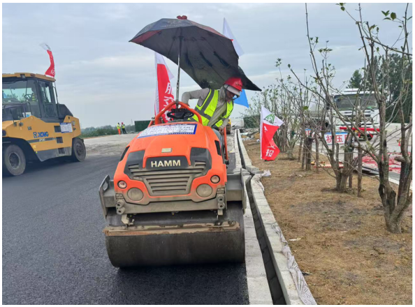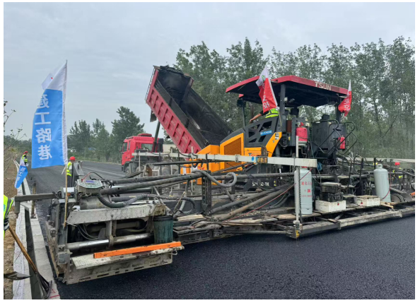 作為“首件工程”,此次試驗段嚴格遵循相關(guān)規(guī)范標準,建設(shè)單位與監(jiān)理公司全程參與、嚴格監(jiān)控。從瀝青、集料等原材料進場的源頭把控,到每一道施工工序的現(xiàn)場檢測,均建立起了一套嚴密且完整的質(zhì)量管控體系。攤鋪作業(yè)采用大寬度攤鋪機施工,確保了路面橫坡,同時根據(jù)現(xiàn)場實際情況,動態(tài)調(diào)整攤鋪機速度與振搗頻率,有效控制了路面的均勻性;壓實環(huán)節(jié)采用多機型組合碾壓,驗證了不同碾壓工藝對路面密實度的影響。