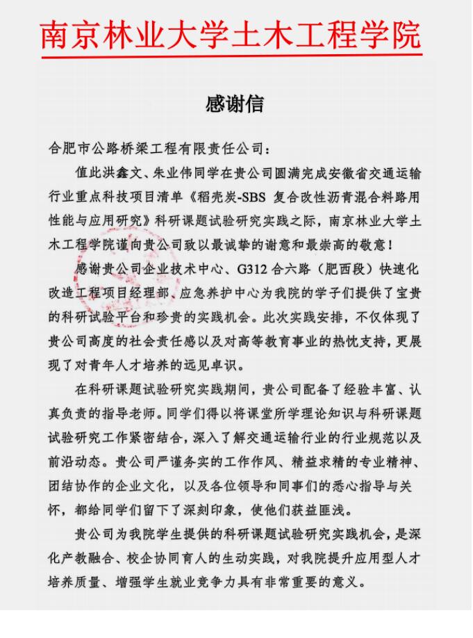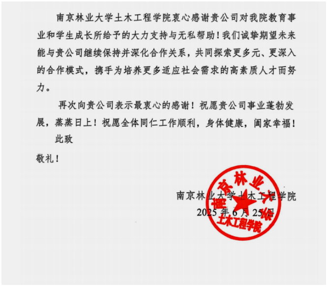 2025年6月25日,合肥路橋收到了一封來自南京林業(yè)大學(xué)土木工程學(xué)院的飽含深情的感謝信。信中,南京林業(yè)大學(xué)土木工程學(xué)院高度贊揚(yáng)并衷心感謝合肥路橋在科研課題試驗(yàn)研究實(shí)踐方面的鼎力支持,并對(duì)企業(yè)展現(xiàn)出的高度社會(huì)責(zé)任感表示崇高敬意。
