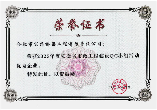 近日,安徽省暨合肥市2025年度市政工程建設(shè)優(yōu)秀QC小組活動(dòng)成果發(fā)布會(huì)順利舉辦,合肥路橋憑借優(yōu)秀組織及多項(xiàng)研究成果,榮獲“2025年度安徽省市政工程建設(shè)QC小組活動(dòng)優(yōu)秀企業(yè)”稱號(hào)。