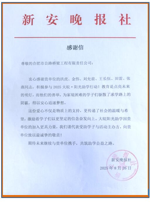 “大皖陽光助學(xué)因貴單位的加入更具力量,我們謹(jǐn)代表受助學(xué)子與活動(dòng)主辦方,向貴單位致以最誠摯的敬意”,近日,新安晚報(bào)社向合肥路橋發(fā)來一封飽含深情的感謝信,對(duì)合肥路橋職工積極參與2025大皖・陽光助學(xué)行動(dòng)表達(dá)誠摯謝意。