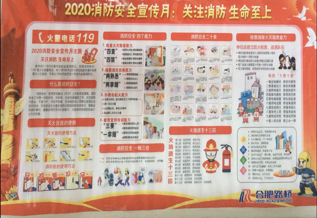 2020年11月9日是全國第二十九個消防宣傳日,本次消防宣傳日主題為:“關(guān)注消防,生命至上”。為保證項目安全施工,合肥路橋分公司各項目分別開展了消防宣傳培訓(xùn)活動。