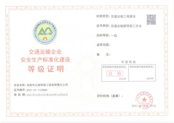 近日,經(jīng)過中國(guó)公路建設(shè)行業(yè)協(xié)會(huì)評(píng)審,合肥路橋順利通過交通部“交通運(yùn)輸企業(yè)安全生產(chǎn)標(biāo)準(zhǔn)化建設(shè)一級(jí)企業(yè)”復(fù)審。