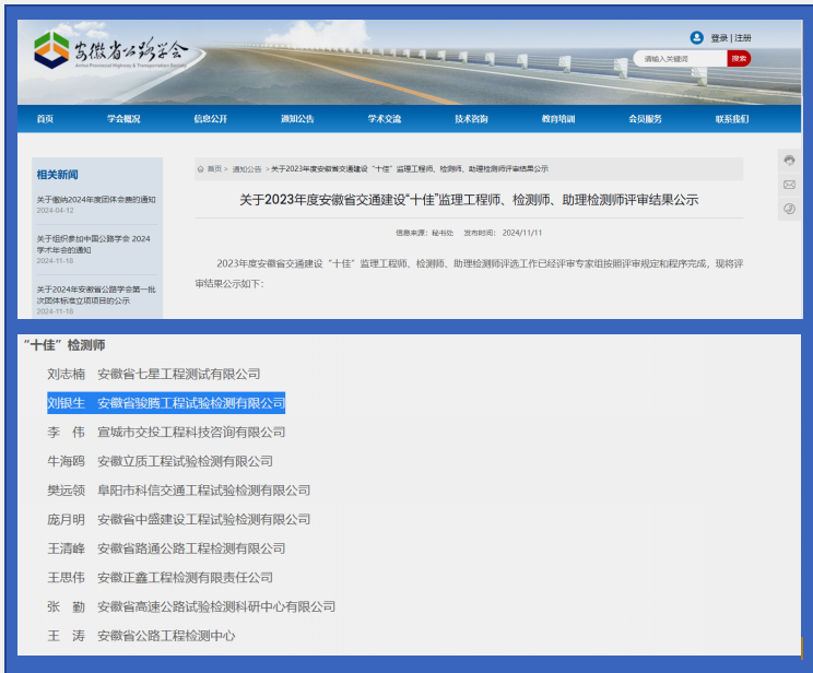 日前,從安徽省公路學(xué)會獲悉,駿騰檢測檢測師劉銀生憑借嚴(yán)謹(jǐn)?shù)墓ぷ鲬B(tài)度和卓越的專業(yè)技能,在行業(yè)內(nèi)脫穎而出,榮獲2023年度安徽省交通建設(shè)“十佳檢測師”榮譽稱號。